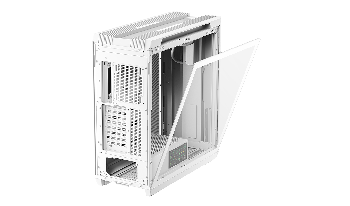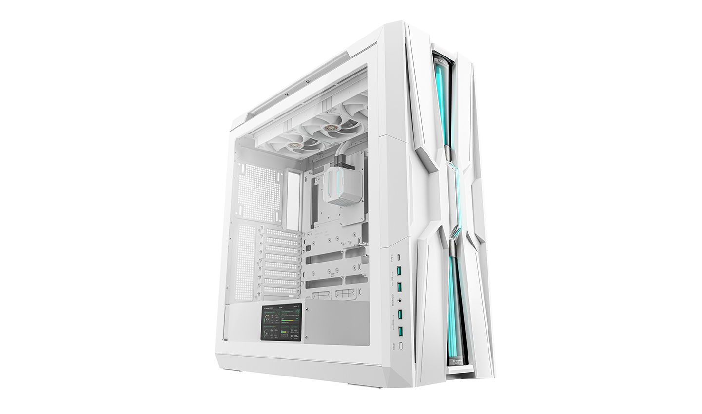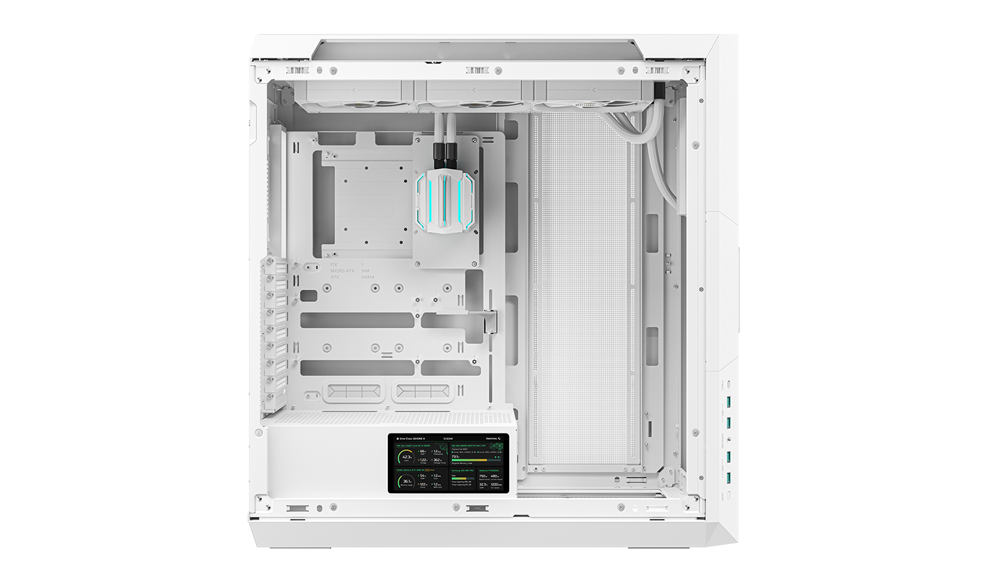 The next evolution of liquid cooling case returns with a bold new design and cutting-edge performance. Now a full-tower chassis, GENOME III WH features an integrated 420mm AIO liquid cooling system, a visible reservoir, and a 5.5-inch LCD screen.