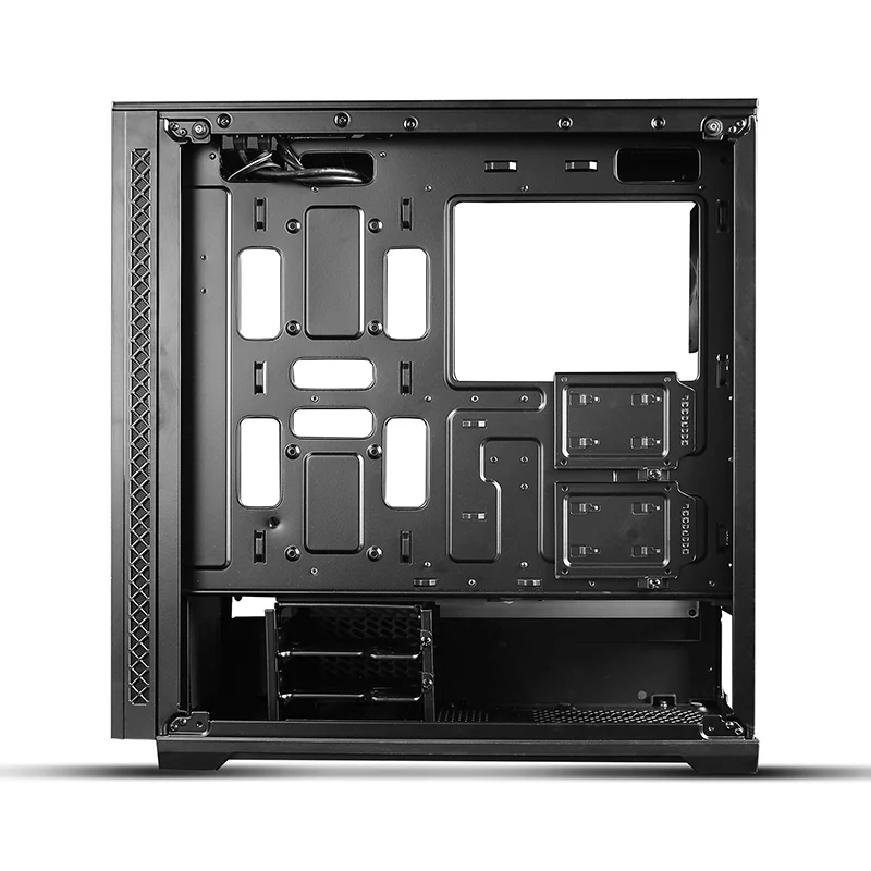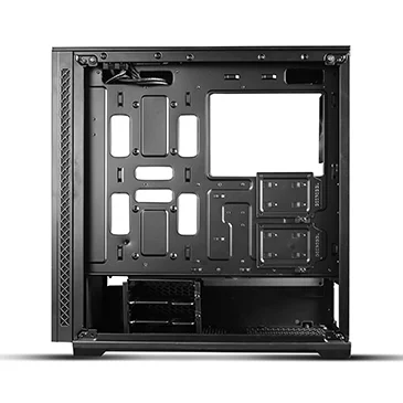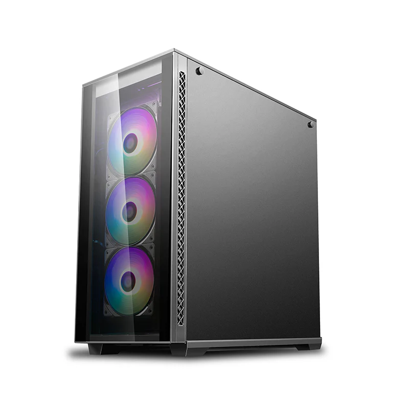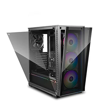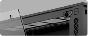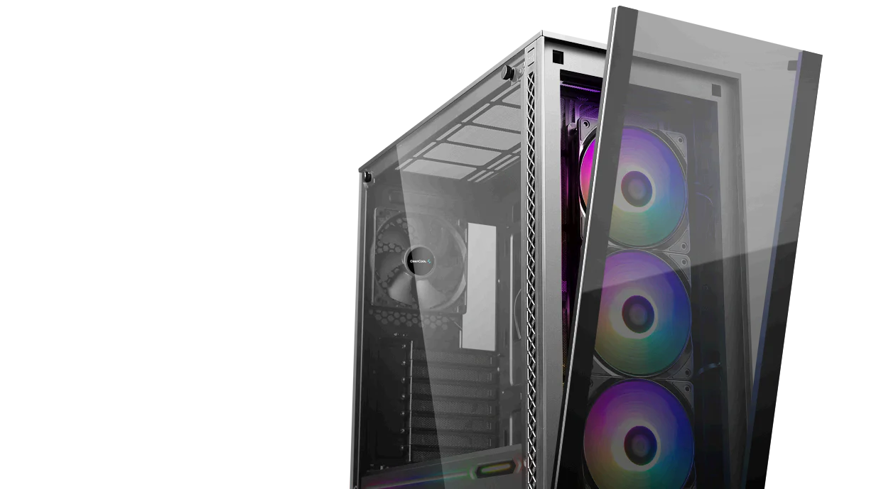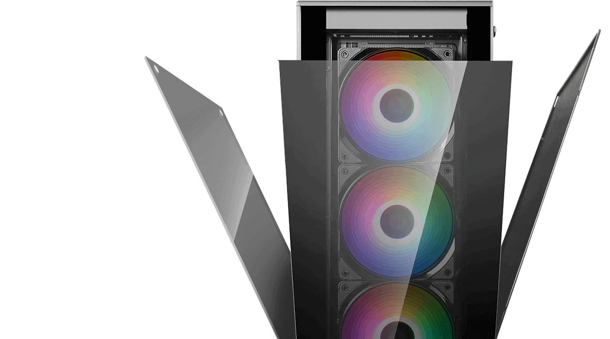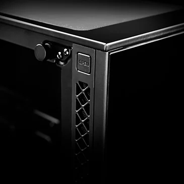 The front glass panel is easily dismounted with a single button press. Side panels can be removed with just two screws.