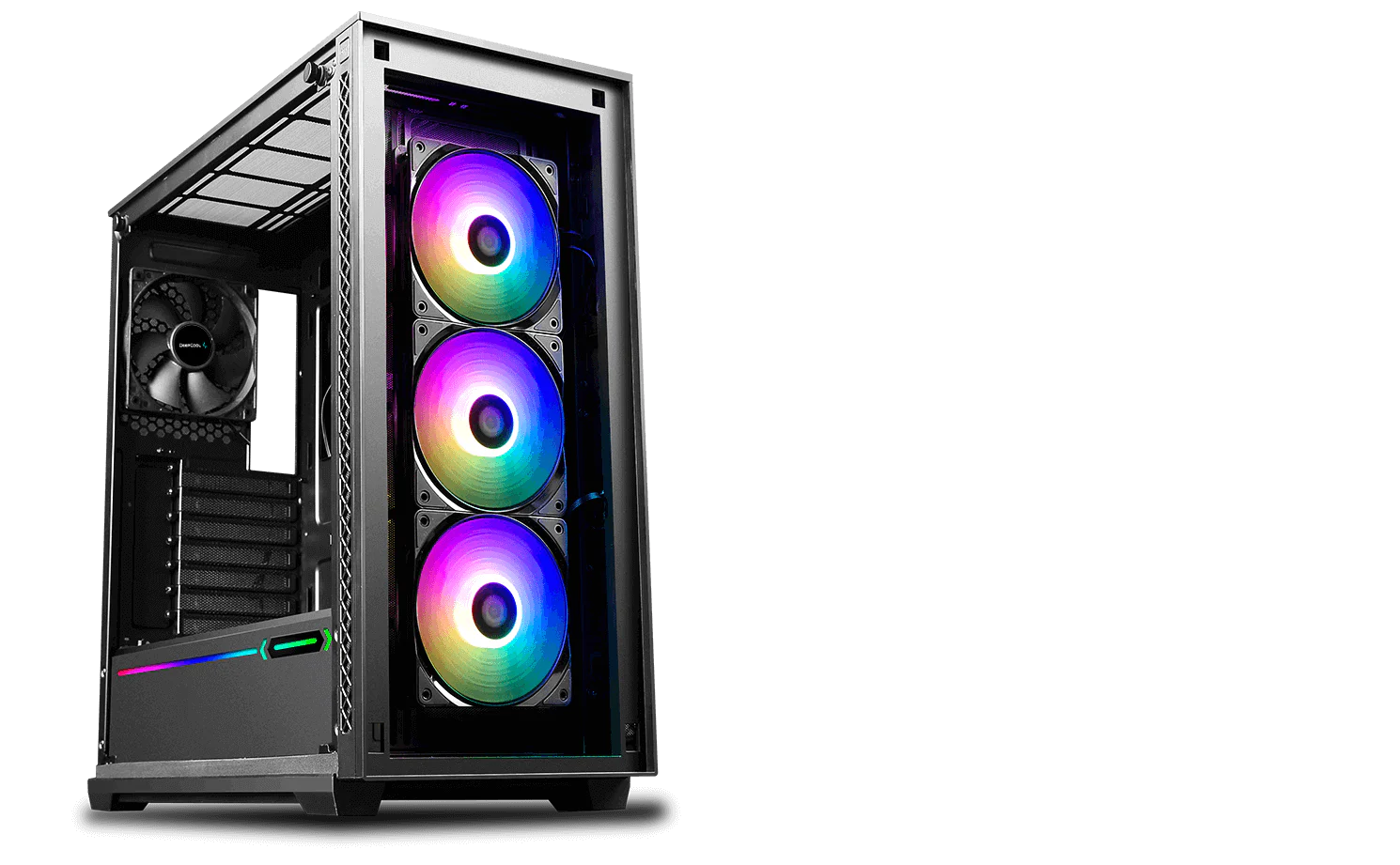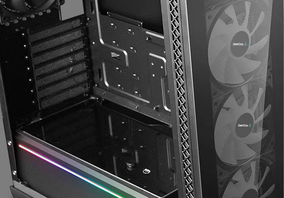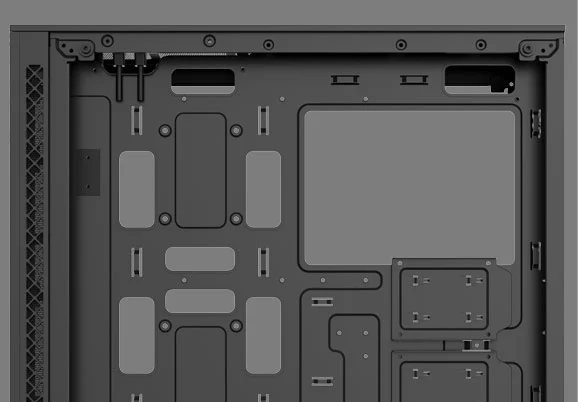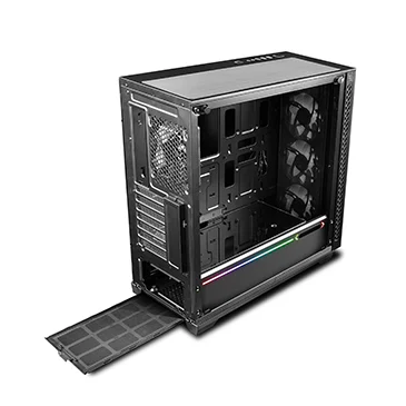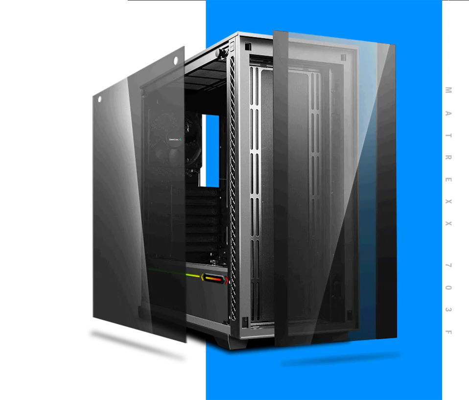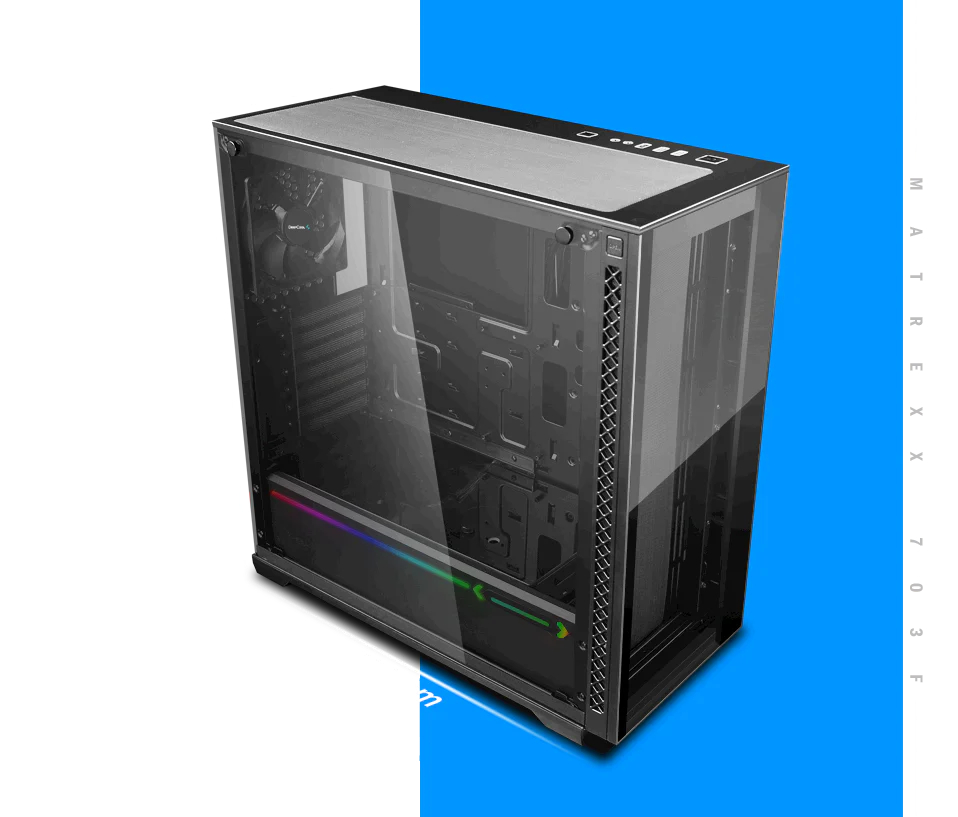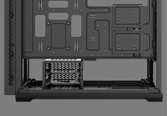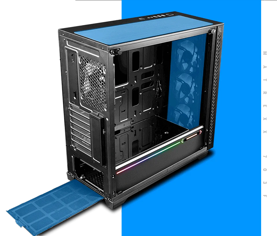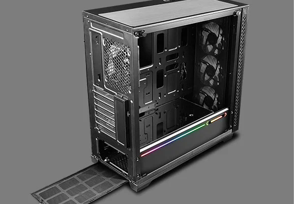 With the bottom hooked to case structure, and the top locked by a spring buckle, the front panel of MATREXX 70 ADD-RGB 3F can be released to “dismounting ready”state with just one touch. Once the “OPEN” button is pressed, the front panel will be released and held at a 5°angel, and is ready to be pulled out.